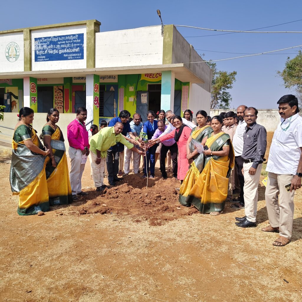 பள்ளி வளாகத்தில் 20 பூவரசம் மரக்கன்றுகள் நட்டு கம்பி வலை போட்டு அதில் தினமும் நீரூற்றி பராமரிக்கும் 20 மாணவ மாணவிகள் பெயர் பொறித்து, முதல் மரக்கன்றுகளை