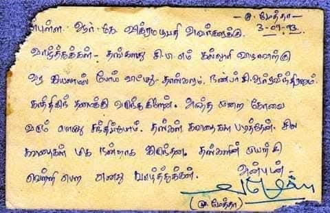சிபிஎம் கல்லூரி தமிழ்மன்ற விழாவிற்கு சிறப்பு விருந்தினராக அழைத்தபோது வர முடியாத சூழலை விளக்கி கவி வேந்தர் மு.மேத்தா தனது கைப்பட 1993 – களில் எனக்கு கடிதம் ஒன்றை எழுதினார்.