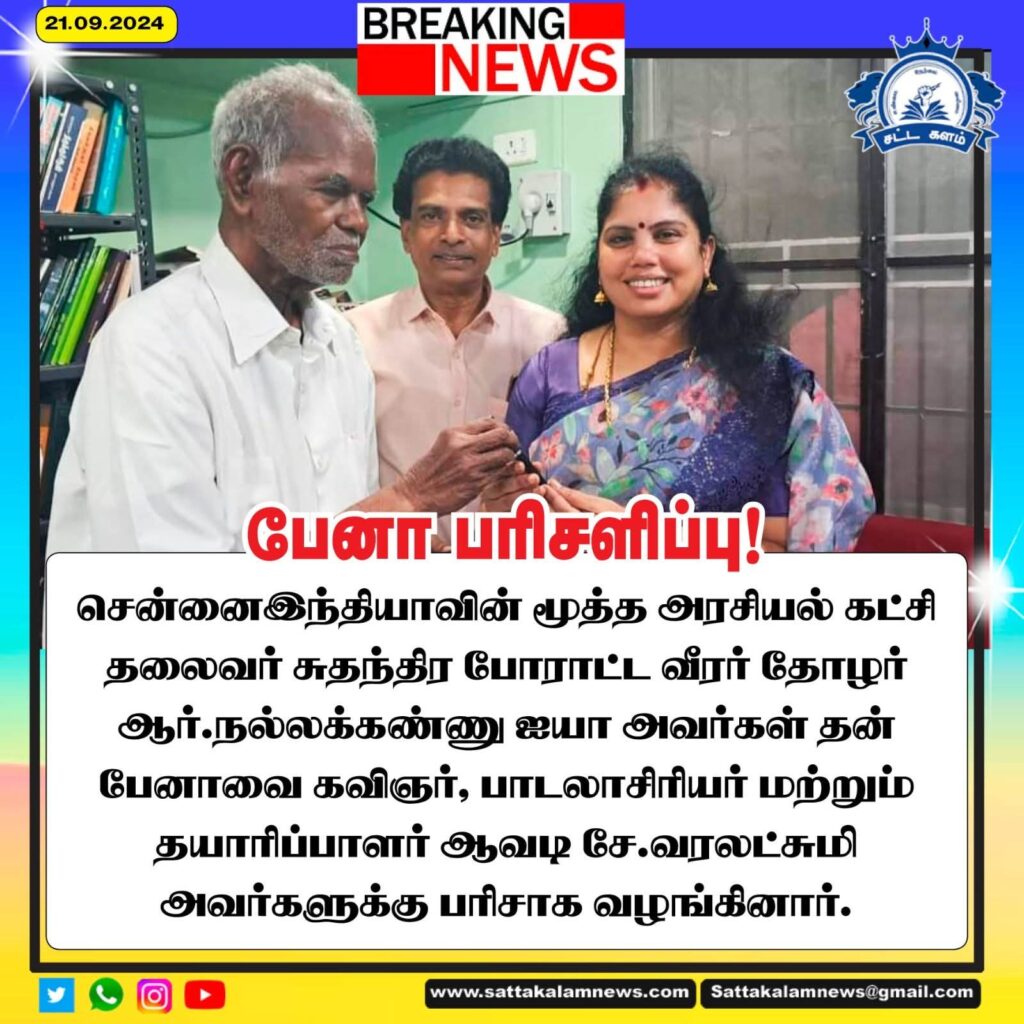 கவிஞர், பாடலாசிரியர் ஆவடி சே.வரலட்சுமிக்கு பேனா பரிசளித்த முதுபெரும் தலைவர் நல்லகண்ணு அய்யா…!!