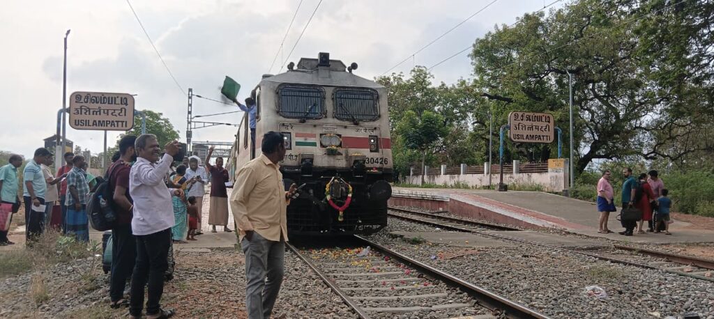 மதுரை மாவட்டம், உசிலம்பட்டி ரயில் நிலையத்தில் சென்னை போடி ரயில் வந்தடைந்தது.,