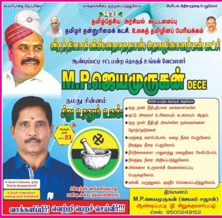 தமிழகத்தில் 2026 – சட்டமன்ற தேர்தலில் போட்டியிடும் வீரத் தியாகி விஸ்வநாத தாஸ் தொழிலாளர் கட்சி வேட்பாளர்கள் பட்டியல்…!! தலைமை ஒருங்கிணைப்பாளர் எஸ்.கே.செல்வம். போன் – 94866 19673 அக்கப்போர் நாளிதழ் akkappore.news சொடுக்குங்க