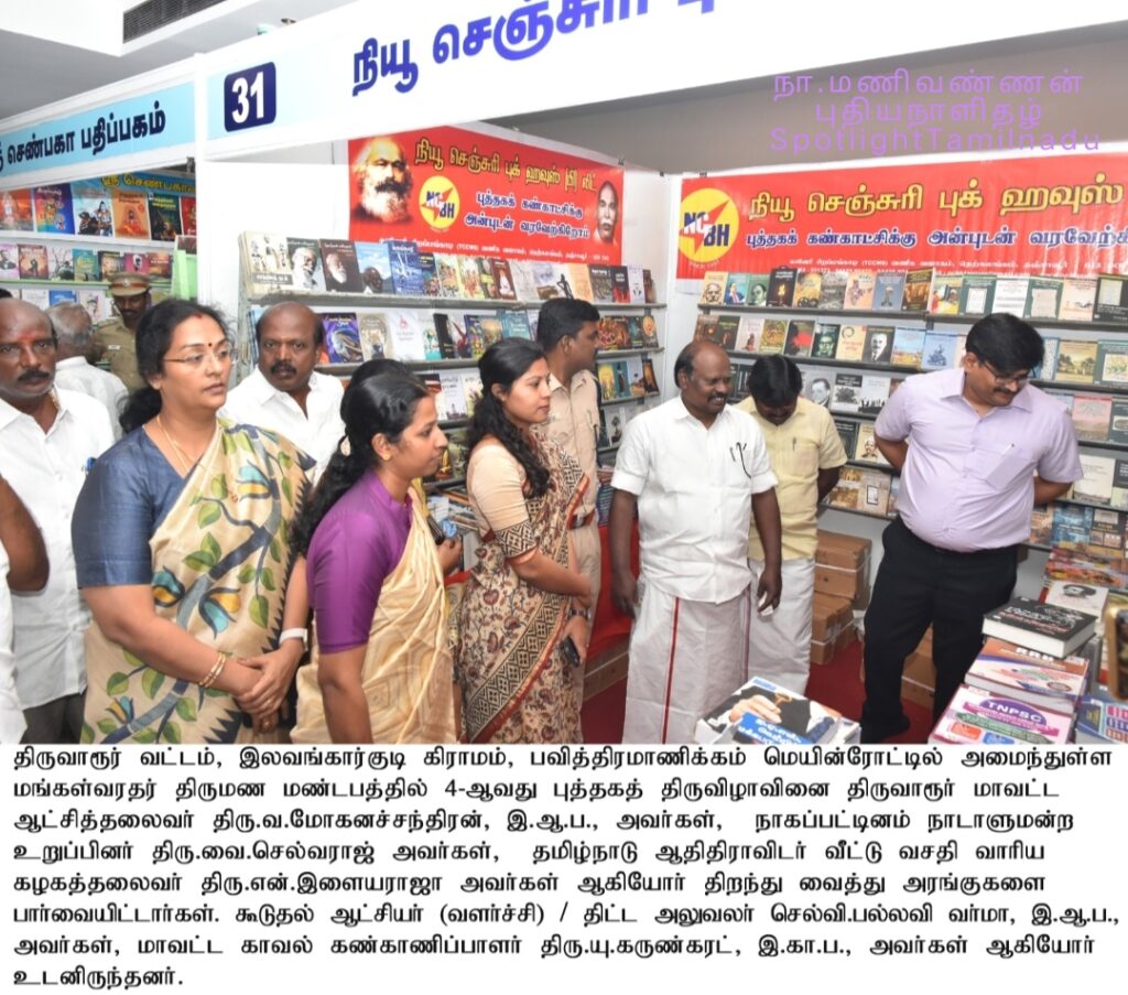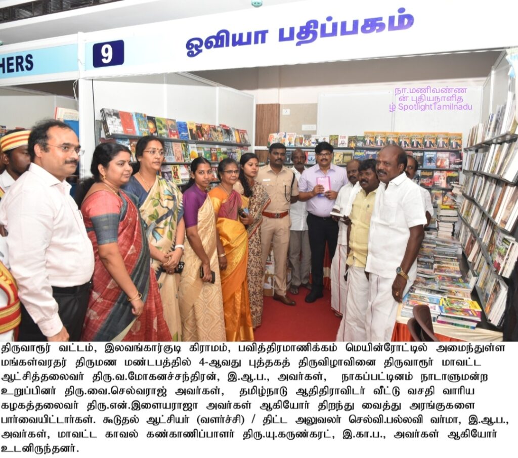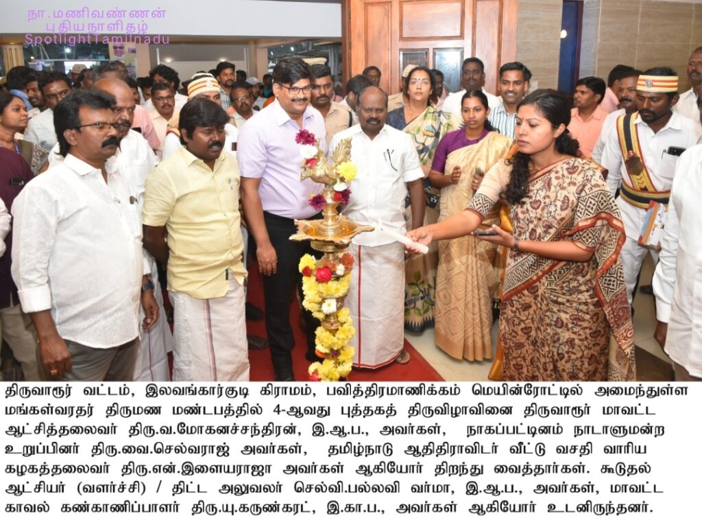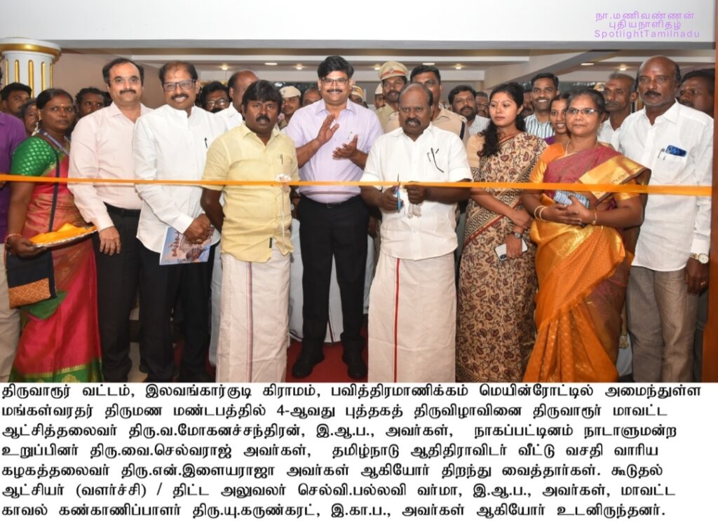 திருவாரூர் வட்டம், இலவங்கார்குடி கிராமம், பவித்திரமாணிக்கம் மெயின்ரோட்டில் அமைந்துள்ள மங்கள்வரதர் திருமண மண்டபத்தில் 4-வது புத்தகத் திருவிழாவை திருவாரூர் மாவட்ட கலெக்டர் மோகனச்சந்திரன் நாகப்பட்டினம் நாடாளுமன்ற உறுப்பினர் வை.செல்வராஜ், தமிழ்நாடு ஆதிதிராவிடர் வீட்டு வசதி வாரிய கழகத்தலைவர் என்.இளையராஜா ஆகியோர் திறந்து வைத்தார்கள்.