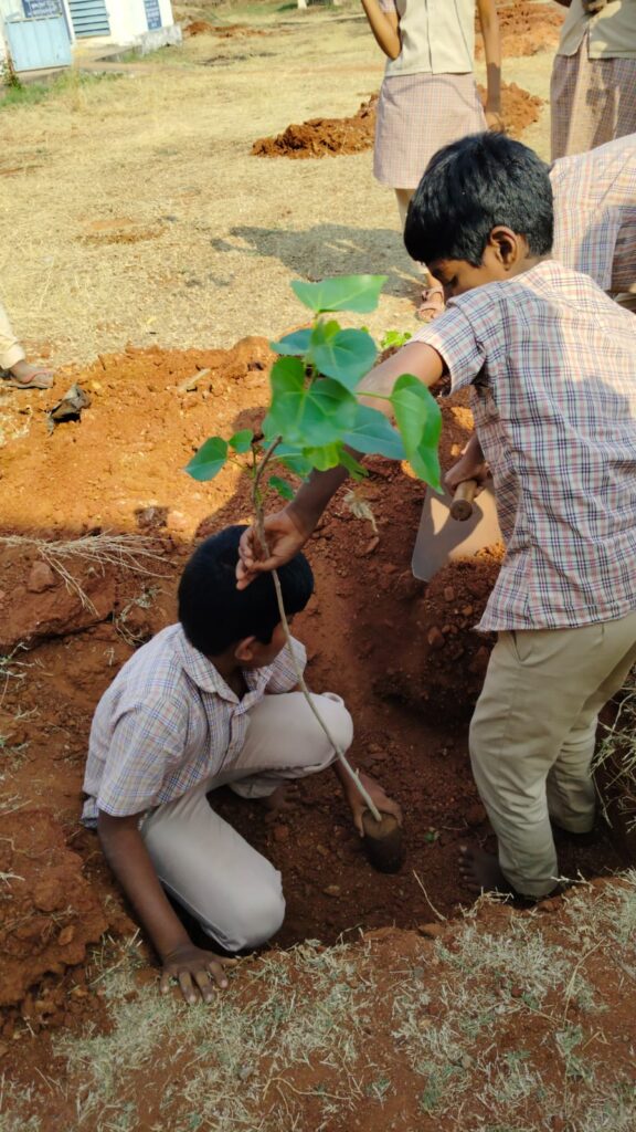 பள்ளி வளாகத்தில் 20 பூவரசம் மரக்கன்றுகள் நட்டு கம்பி வலை போட்டு அதில் தினமும் நீரூற்றி பராமரிக்கும் 20 மாணவ மாணவிகள் பெயர் பொறித்து, முதல் மரக்கன்றுகளை